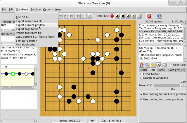Kombilo is a Go database management and pattern search program. It can generate Sensei's Library text output. The description here is based on version 0.7.4 of Kombilo.